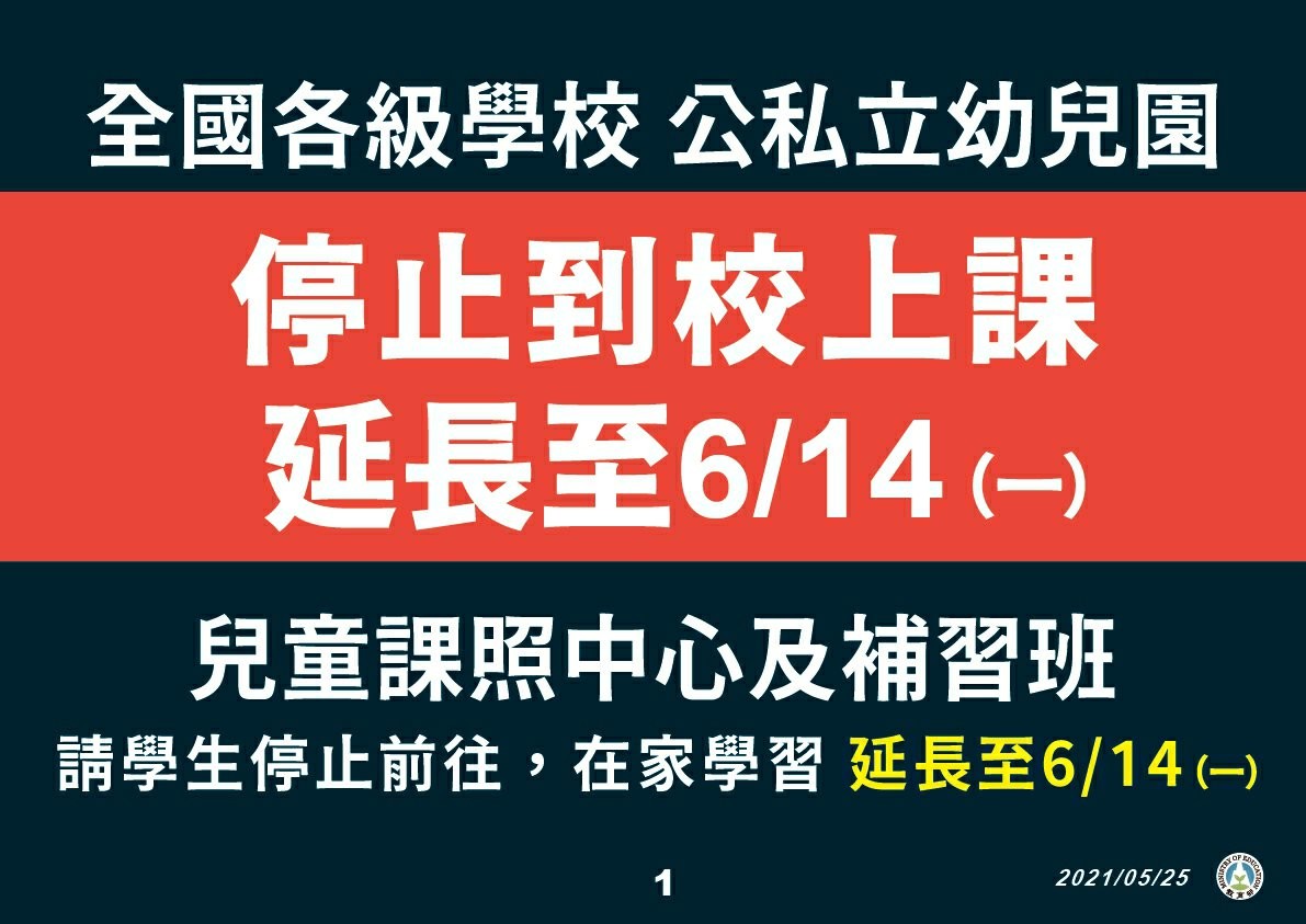 因應疫情嚴峻.目前全國停課時間延長至6月14日, 為保護你我的健康與安全.