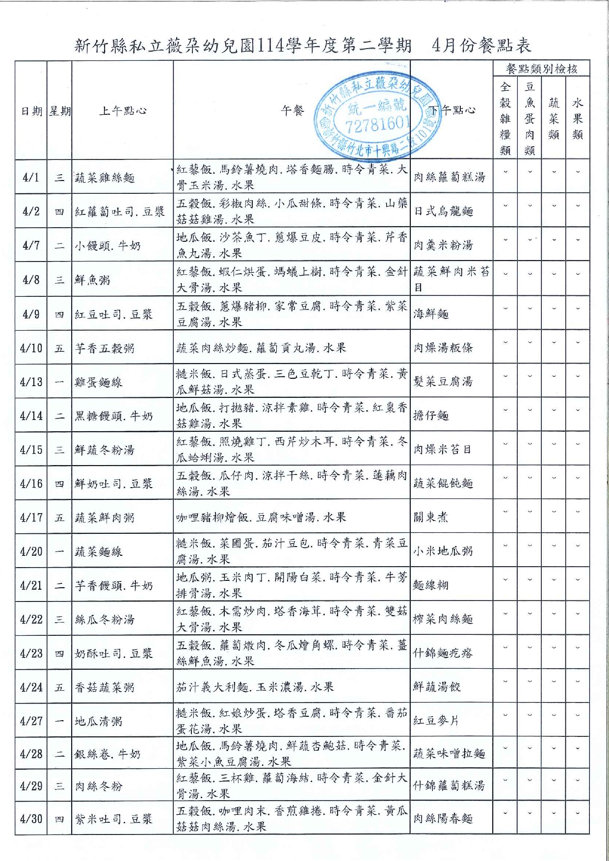 4月份營養餐點表